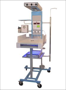 MEDILAP MRW-04+ -Infant radiant warmer with suction unit and undersurface phototherapy with integrated bed and tray below for stocking essential items.