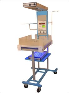 MEDILAP MRW-03+ -Infant radiant warmer with undersurface phototherapy unit integrated bed and tray below for stocking essential items.
