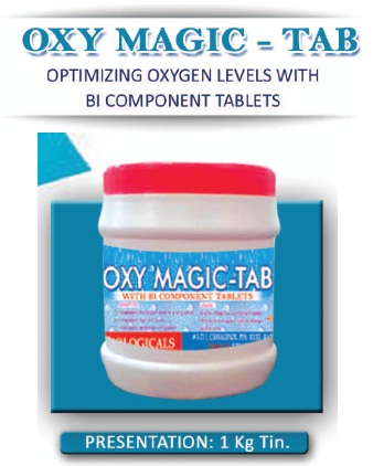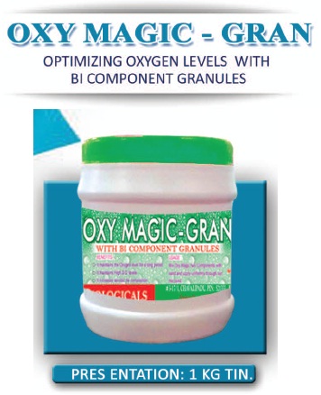 Releases effective Oxygen at Pond bottom level. Absorbs noxious gases.Corrects the Oxygen abnormalities and prevents the stress & diseases. Enhances survival and growth.
