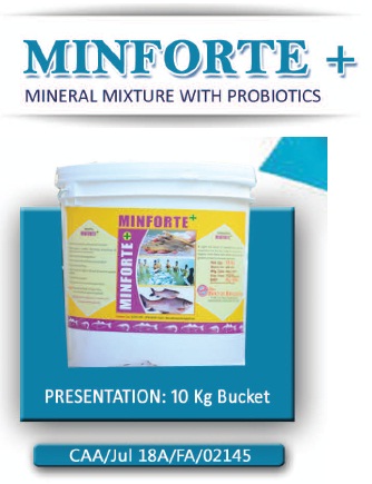 Copper Sulphate, Manganese Sulphate, Cobalt Sulphate, Magnesium Sulphate, Potassium Iodide, Ferrous Sulphate, Zinc Sulpate Mono, Sodium Sulphate, Sulphar, D.L Mithaline, Lysine, Choline Chloride, Selinium, Mixed Probiotics and Di Calcium Phosphate. MINFORTE + consists of adequate colony forming units of Bacillus Subtilis, Bacillus Licheniformis, Bacillus Megaterium, in combination with essential Micro & Macro Minerals forti- fied with DL Methionine and L Lysine in a stable and a compatible base.