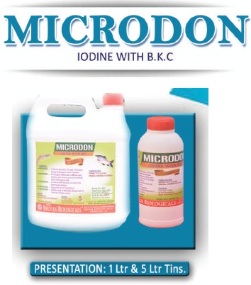 IODINE —1036 and B.K.C Benzalkonium Chloride Widely used at Mortality Stage both in Fish and Prawn ponds. A perfect disinfectant for both Fish and Prawn culture. Regulates Dino Flagellates. Controls Bacteria, Viruses, Protozoa, fungal Pathogens and Parasites.Thoroughly dissolves in water upto bottom level of the pond to eliminate other Pathogens also.