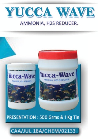 YUCCA-WAVE is recommended at the rate of 300 grms to 500 grms per 1 acre, depending on the stocking density and days of culture. After mixing YUCCA-WAVE with sand and a little water, this mixture has to be applied evenly to cover the complete pond area. Repeat the application once in evey ten days.