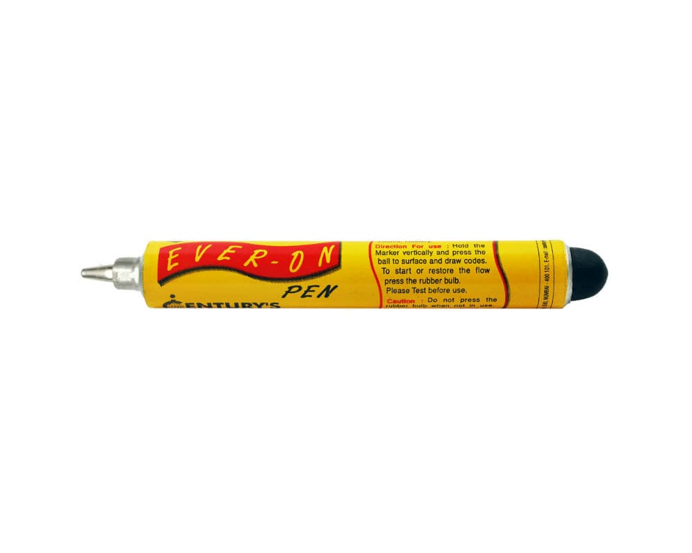 Century's Everon Pen is a fine point fabric marker used in the textile industry and laboratories for fabric shrinkage testing. It has a hard aluminum body filled with ink and a rubber valve on the bottom, when pumped slightly pushes the ink towards a fine ball point for sharp, fine marks. It is widely used in laboratories and textile mills to verify the dimensional stability (shrinkage) of fabrics with a grooved template after washing and processing into fabrics. It is similar to dalo texpen in many parts of the world. It comes with two types of tips: plastic (1.5mm) and stainless steel (1.2mm).