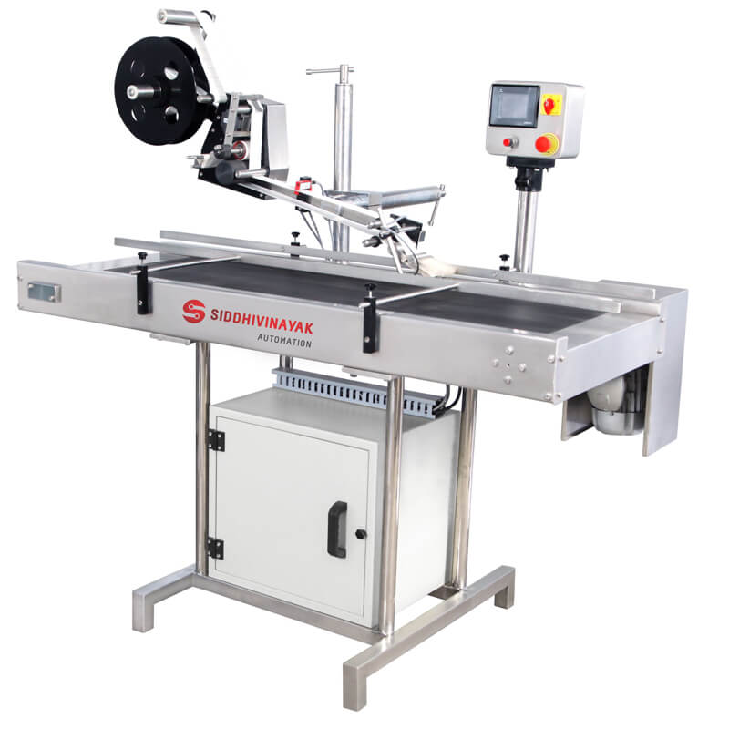 Automatic Top Bottom Labeling Machine - SVATBL unique model is suitable for applying label on multiple side of pouch, carton or any various sizes of small containers.