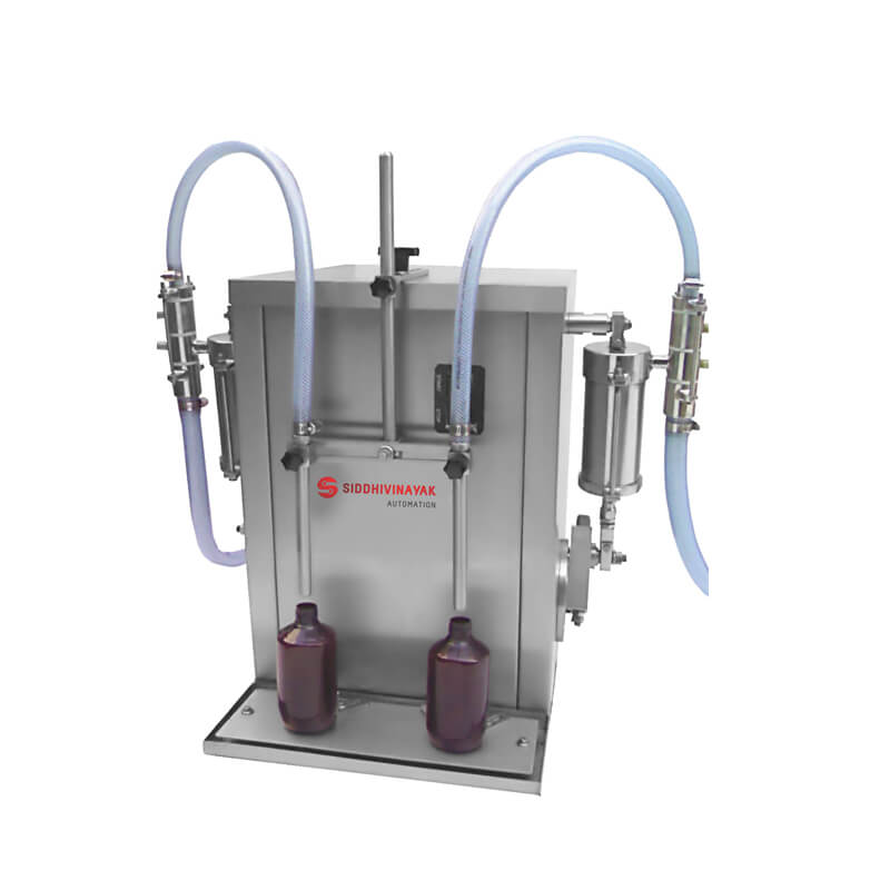 Containers have to place one by one manually below the filling nozzles at platform of machine. The motor operated syringes fill desire pre set volume in container, bottle guide are provide for precisely match for centering of container below nozzles, to avoid spillage of liquid on container.